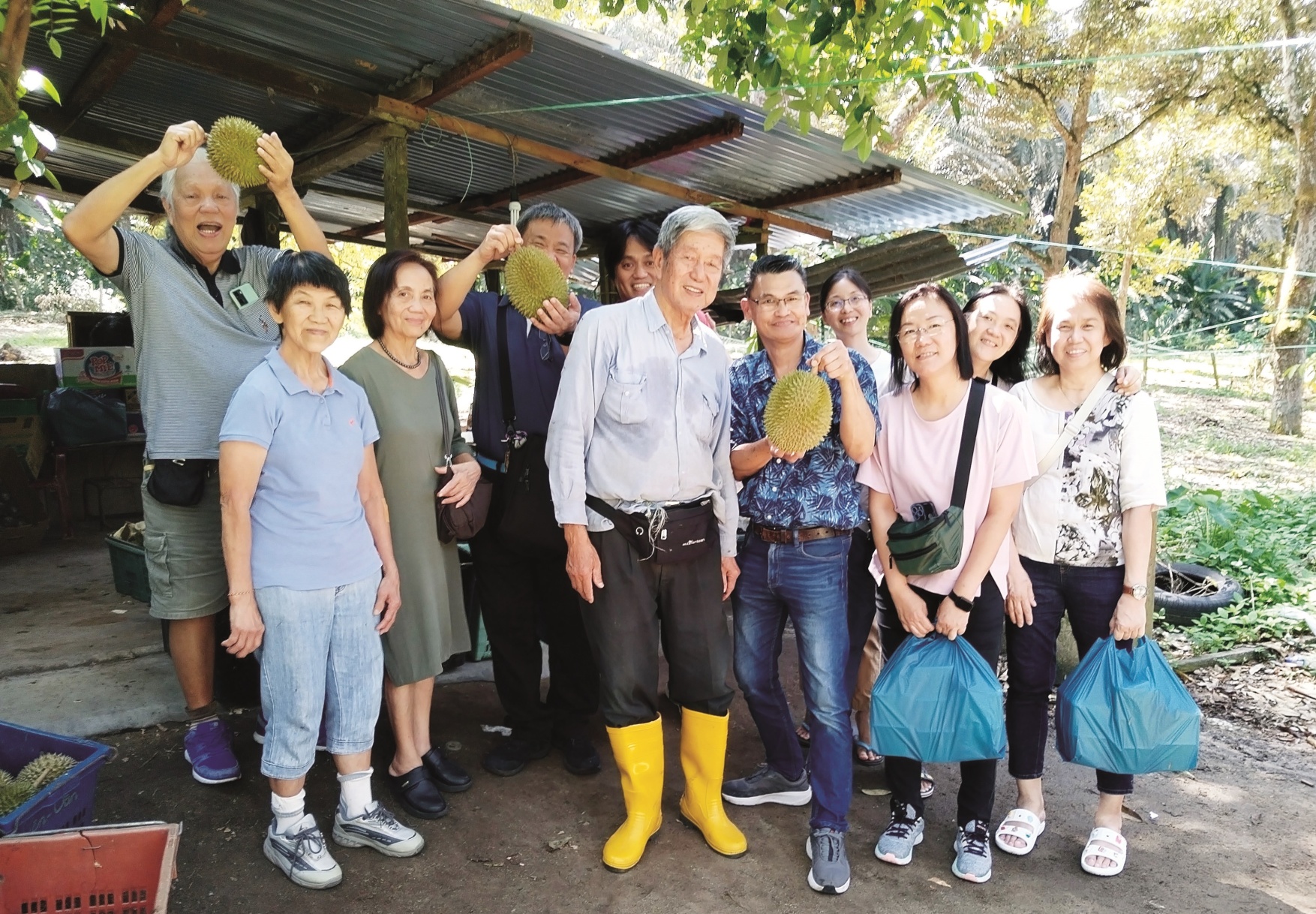 每逢S17掉落季节,新加坡和国内老饕都会前往萧秀钦(前排右四)的果园大快朵颐一番。