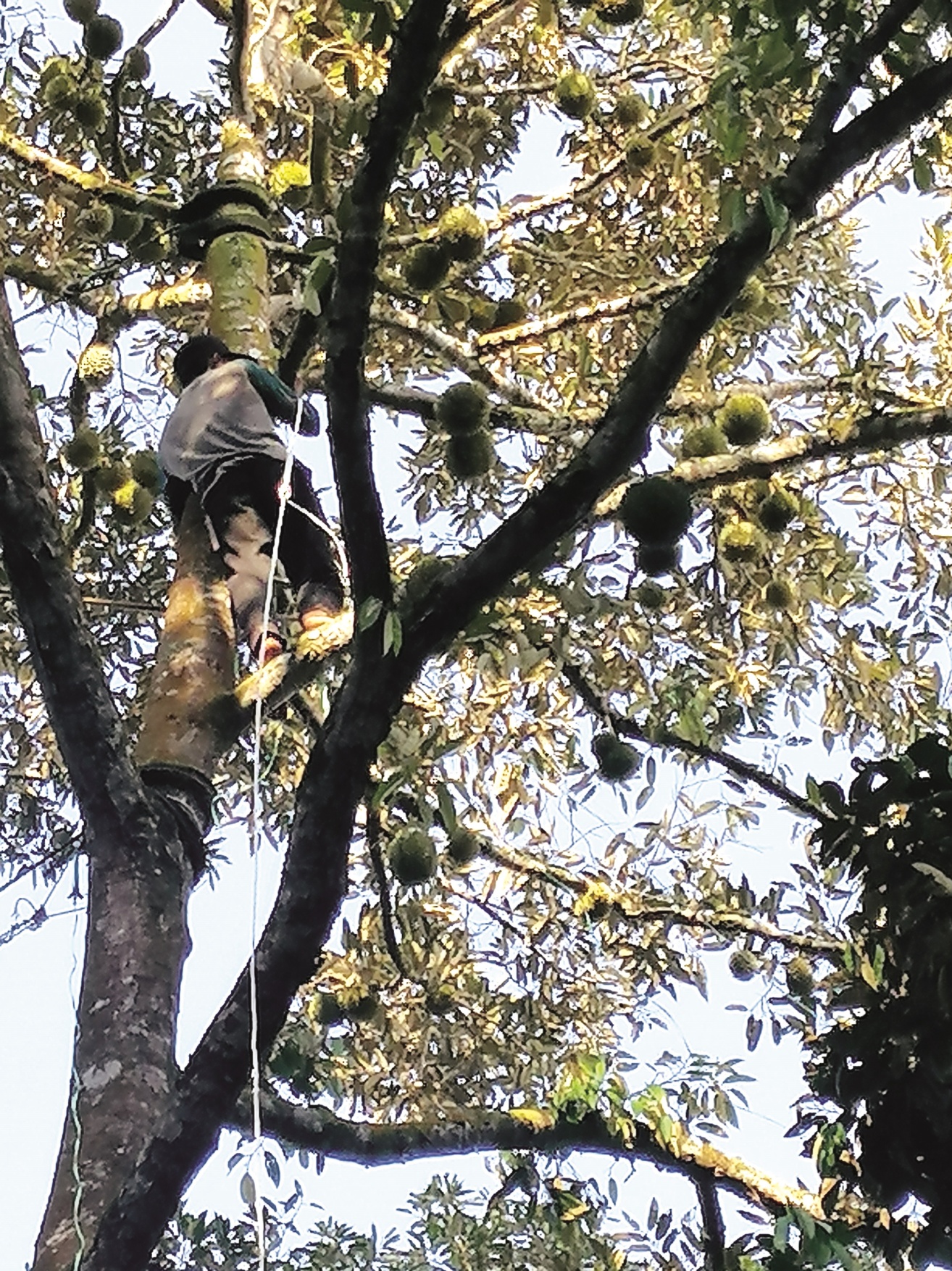 S17结果累累时,工人在高耸的榴梿树上,游刃有余的吊绑榴梿枝干以免枝干断裂。