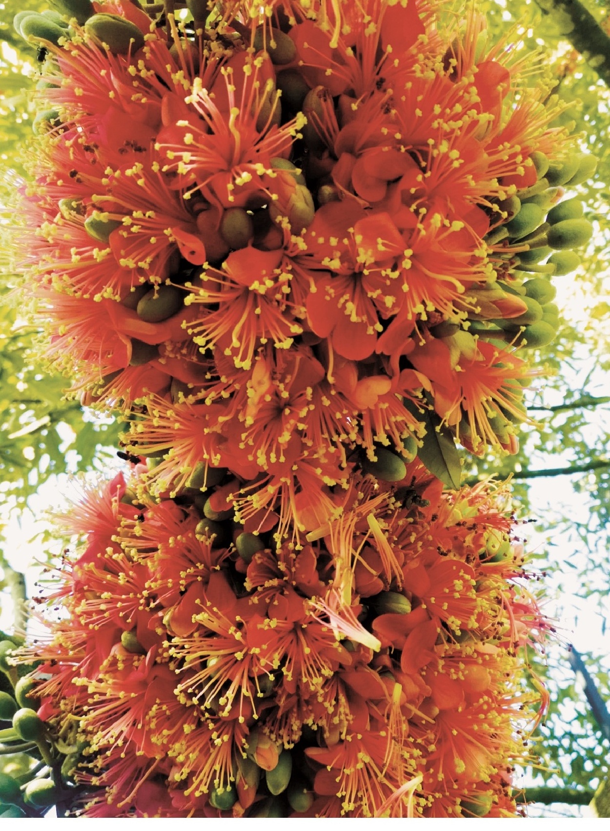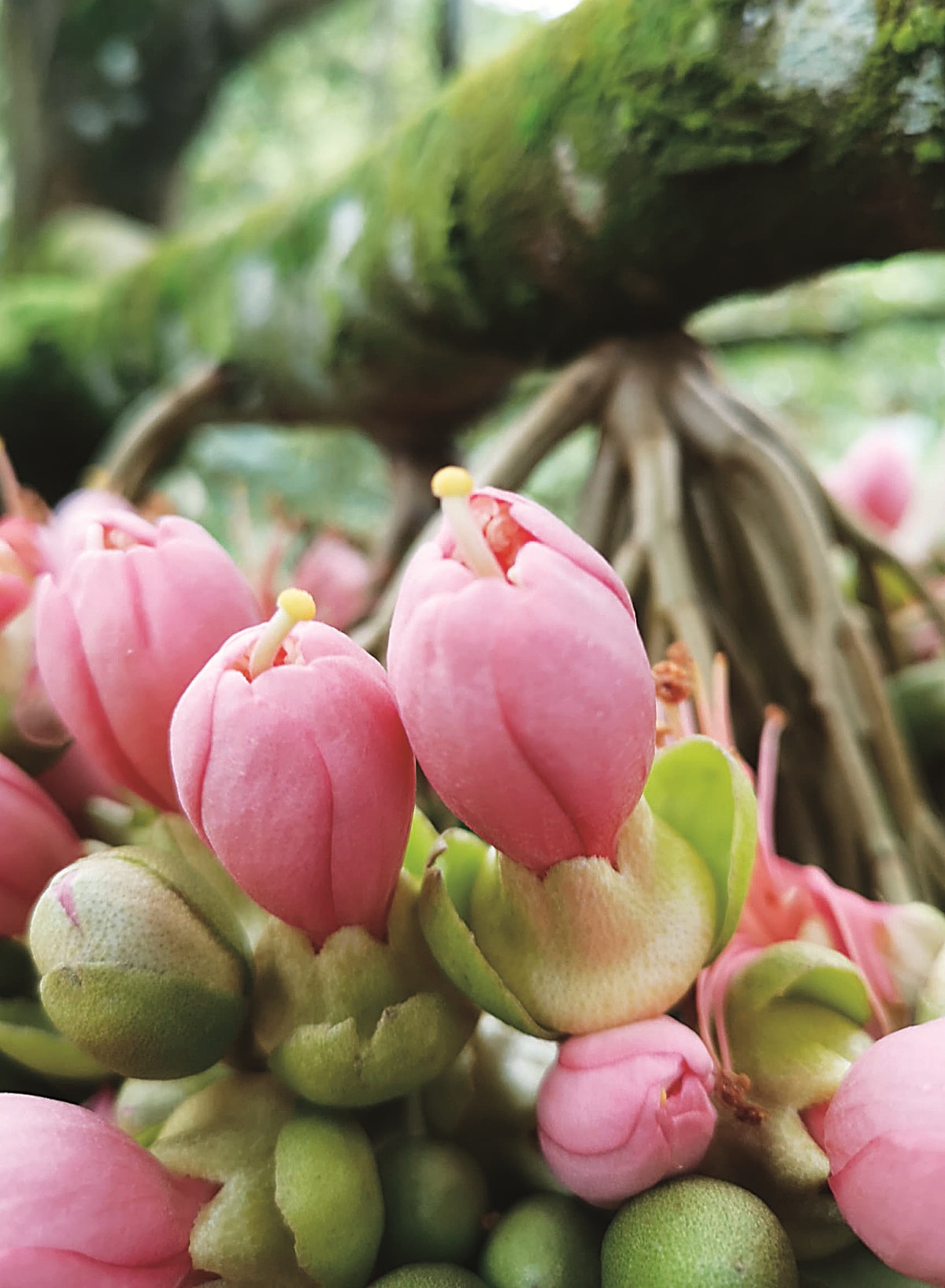 粉红花山榴梿开花时,由于其花朵略带甜味,往往成为猴子破坏的对象。即使满树开花,最终却未能结果,实在可惜。