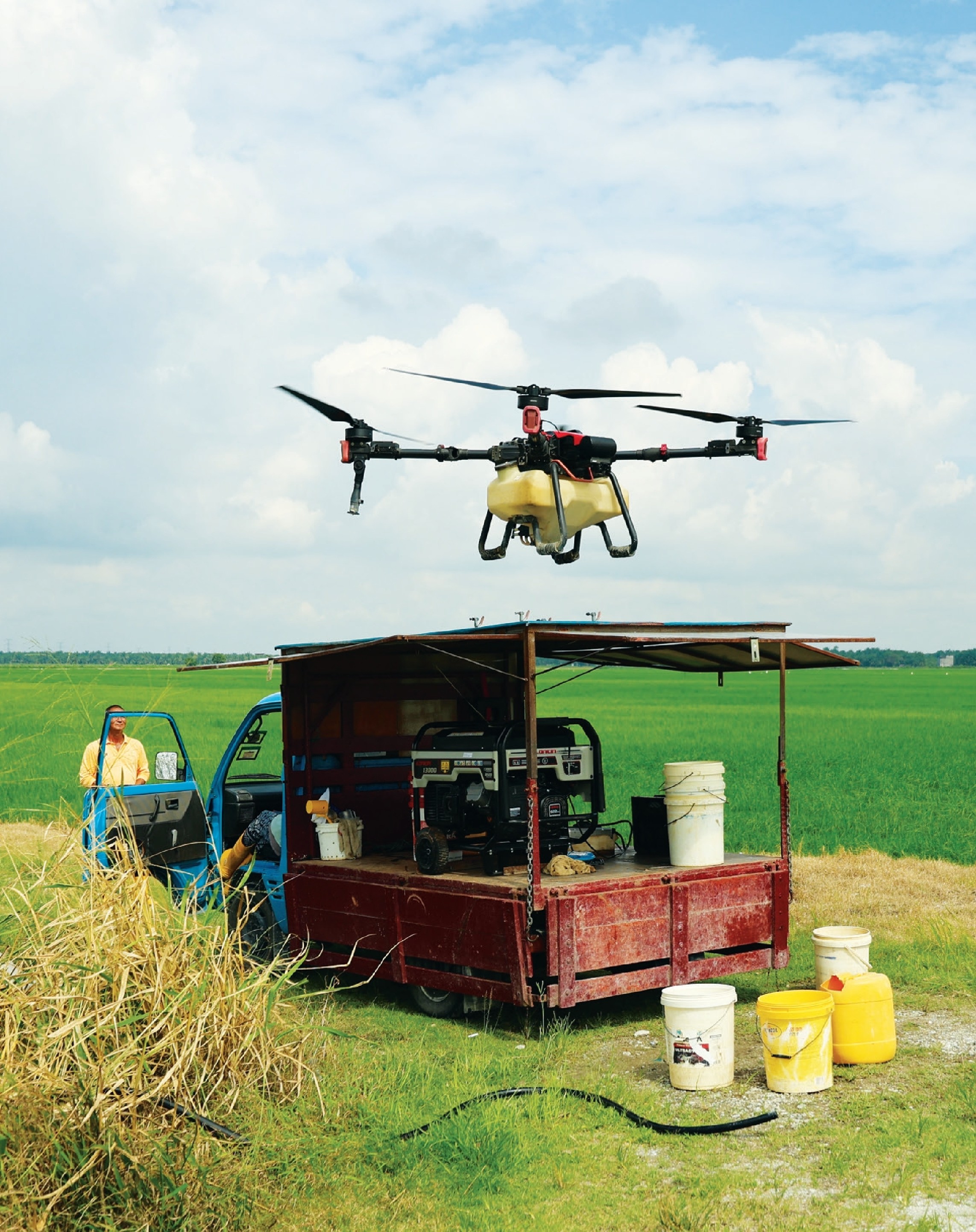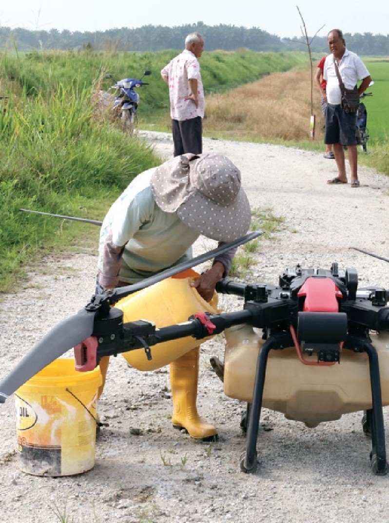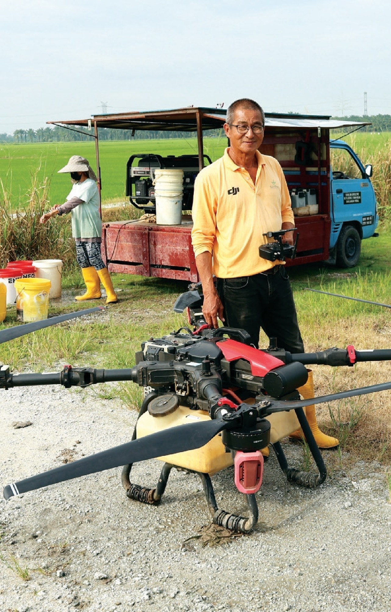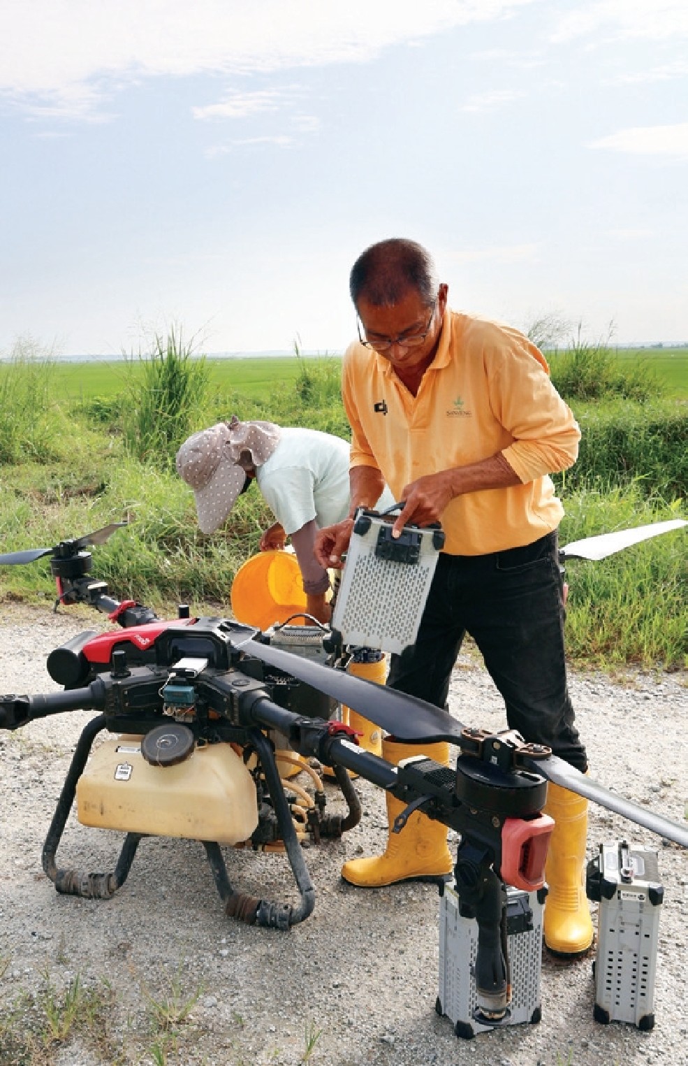 农用植保无人机喷洒农药的功效已获得卓著验证,下霹雳地区的水稻农户纷纷改以飞防技术取代人工作业,甚至催生了包工打药的新行业。通过科技助力田间管理、防治病虫害,不仅使谷米生产得到大幅提质增效,收成更是格外理想。这种情况在水闸新村稻田区尤其明显。