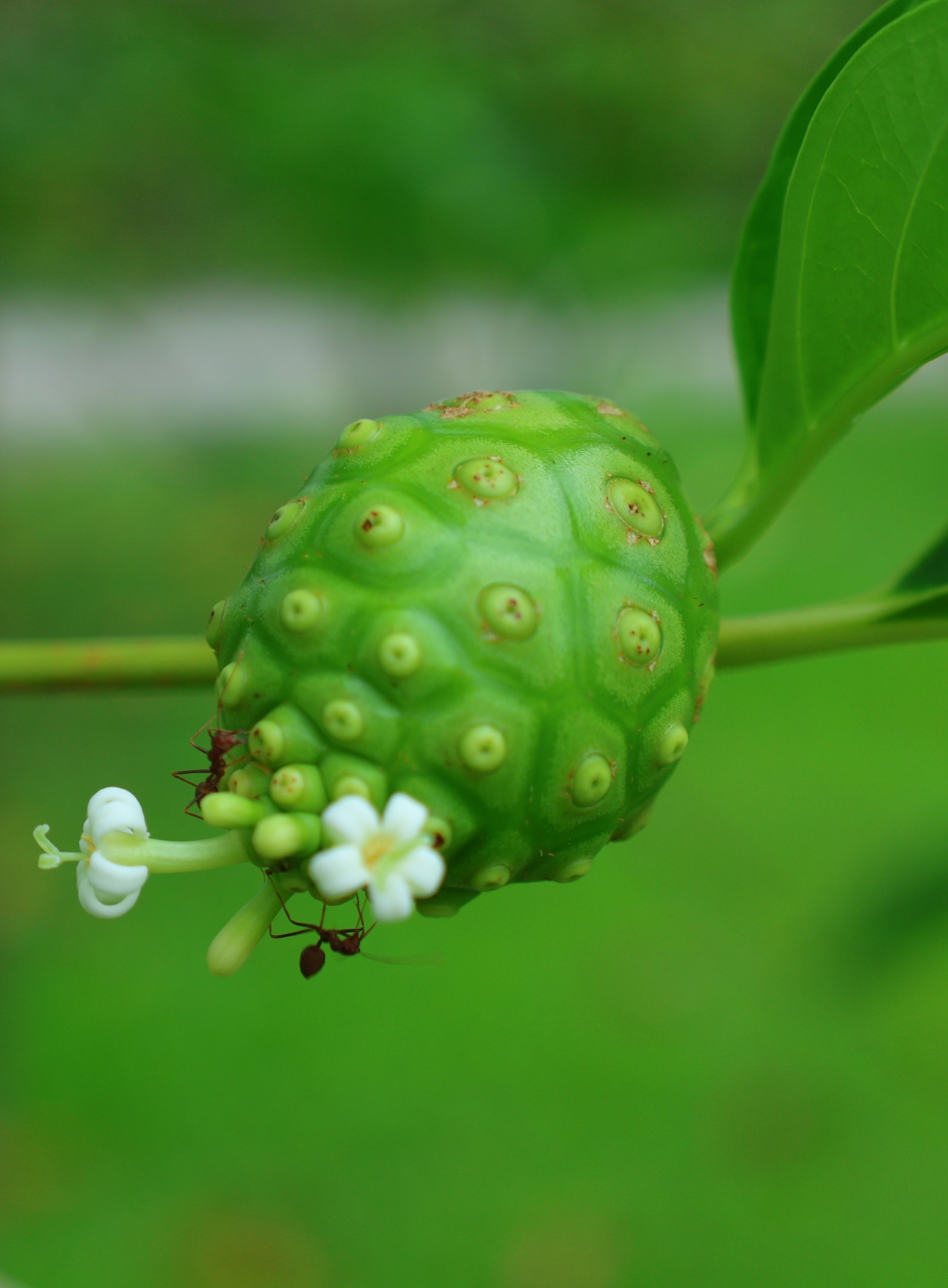 令人欣喜的是,诺丽树全年不断开花结果。同一株树上会同时出现花朵、小果和大果,各自处于生长阶段。从花序初现到花朵形成,再到小绿果发育为半透明的成熟果,整个过程约需6个月。