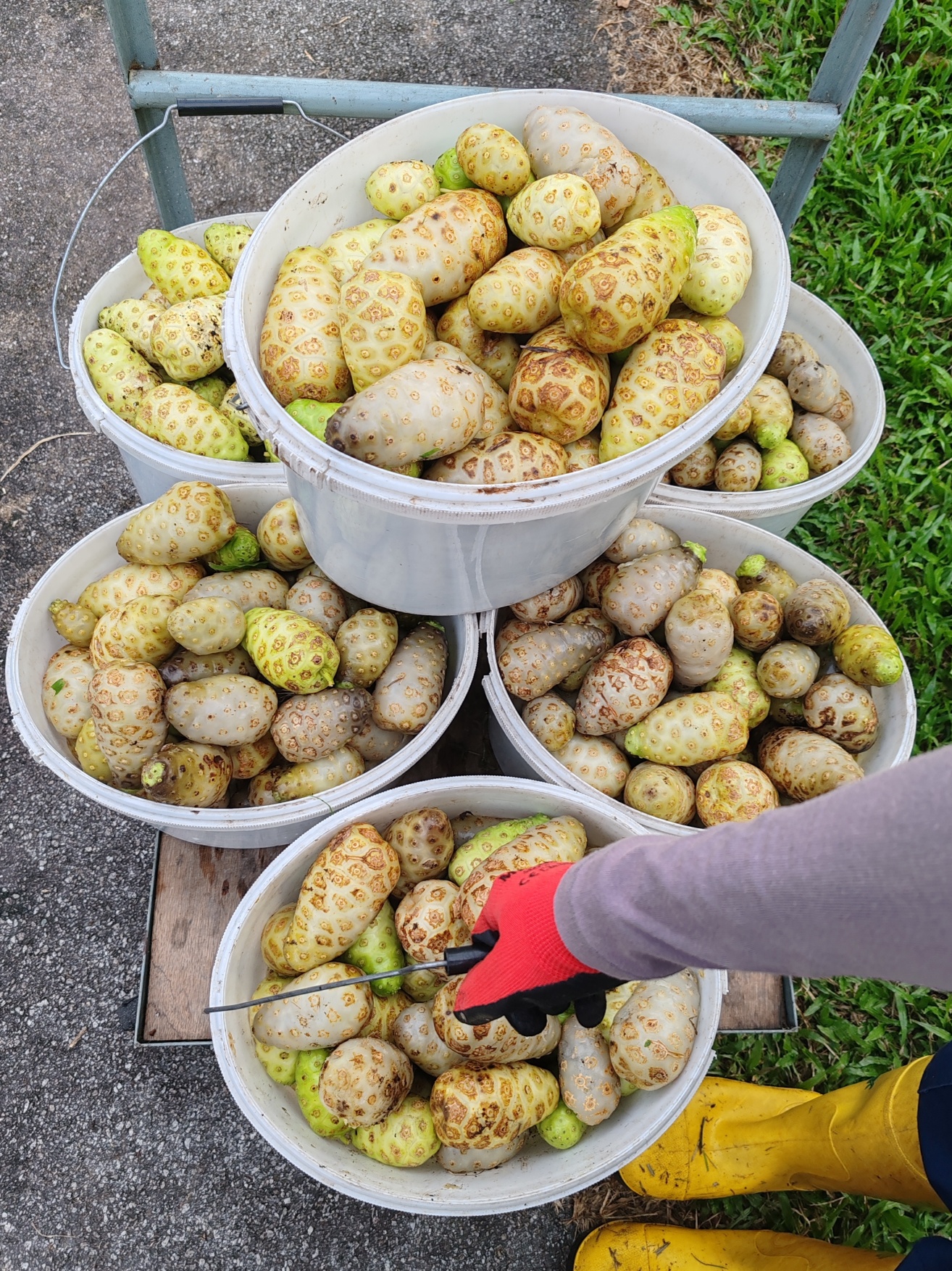 目前果园面积逾1英亩,栽种约300棵4年树龄的诺丽树,产量已进入稳定期,每月平均可采收约1吨果实,未来计画扩充规模,以应付日益增加的市场需求。