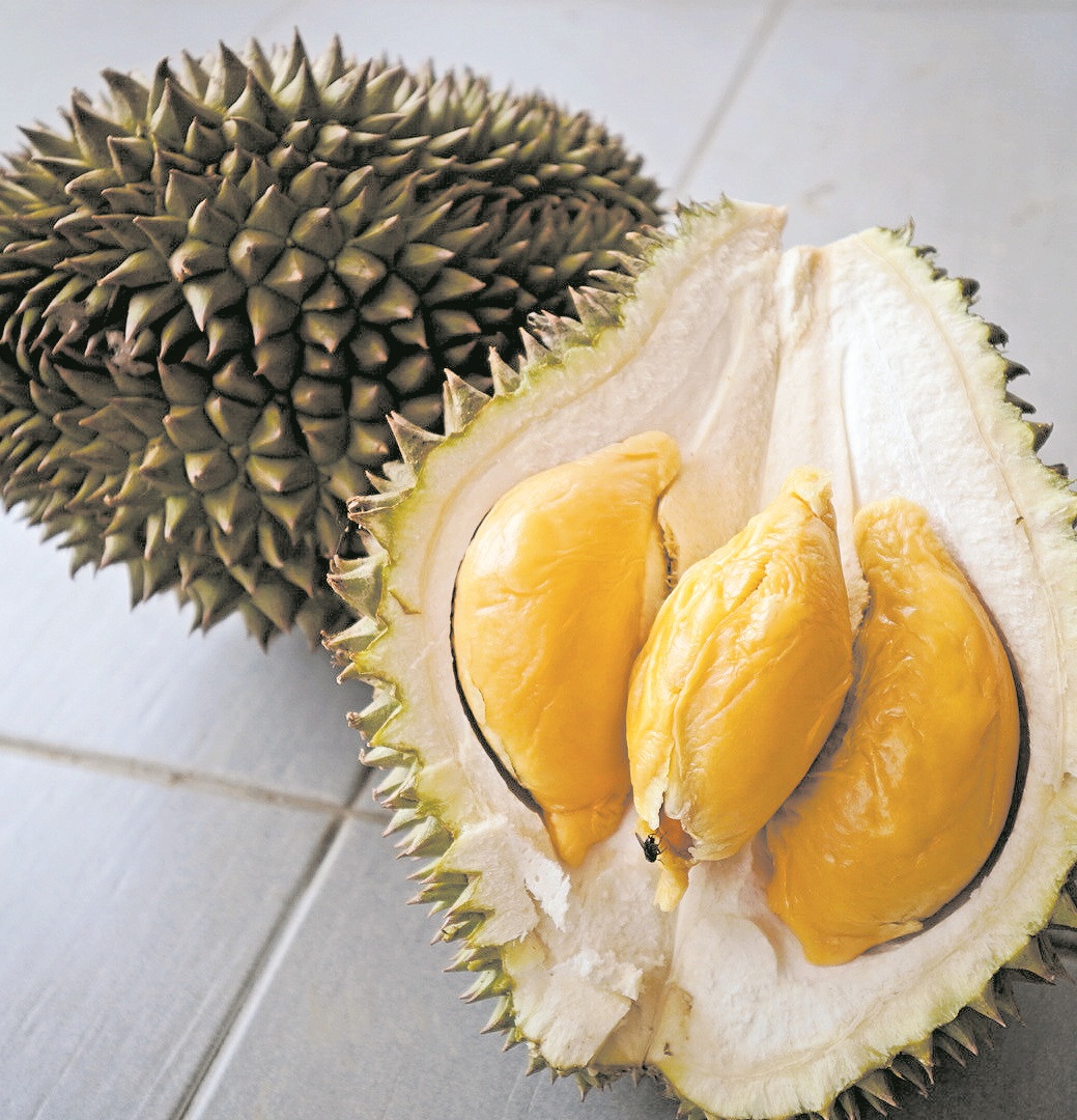 这棵已有四十多年树龄的金龙榴梿树,所结出的果实名副其实,果肉呈现橘黄带金的耀眼色泽。