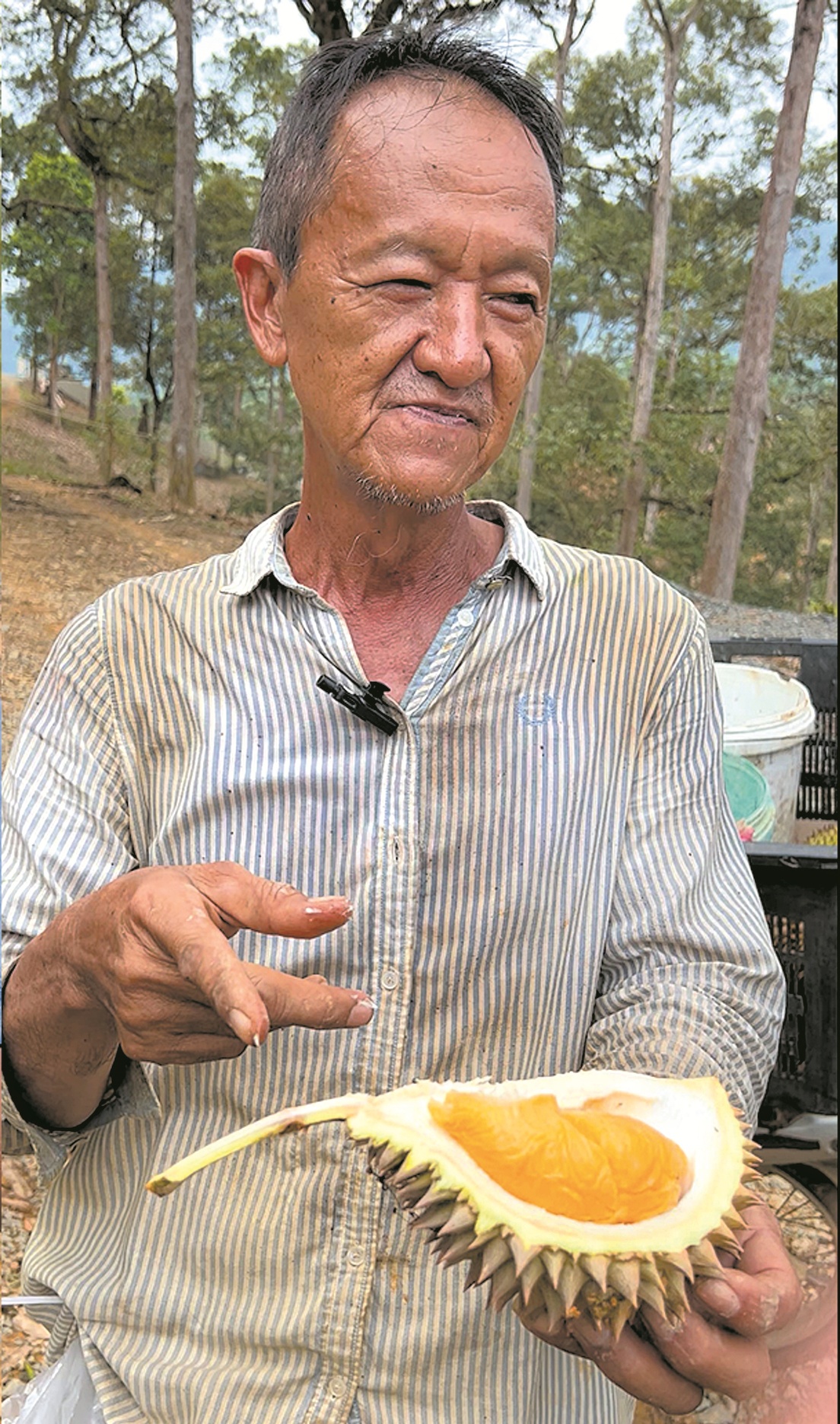 这片果园由林金水先生管理,他是第二代经营者,对山林里的榴梿了如指掌,却也坦言因老树品种太多,连他都未曾一一品赏。他透露,这棵金龙榴梿已有四十多年树龄,目前全马仅此一棵能结果,极其珍贵。