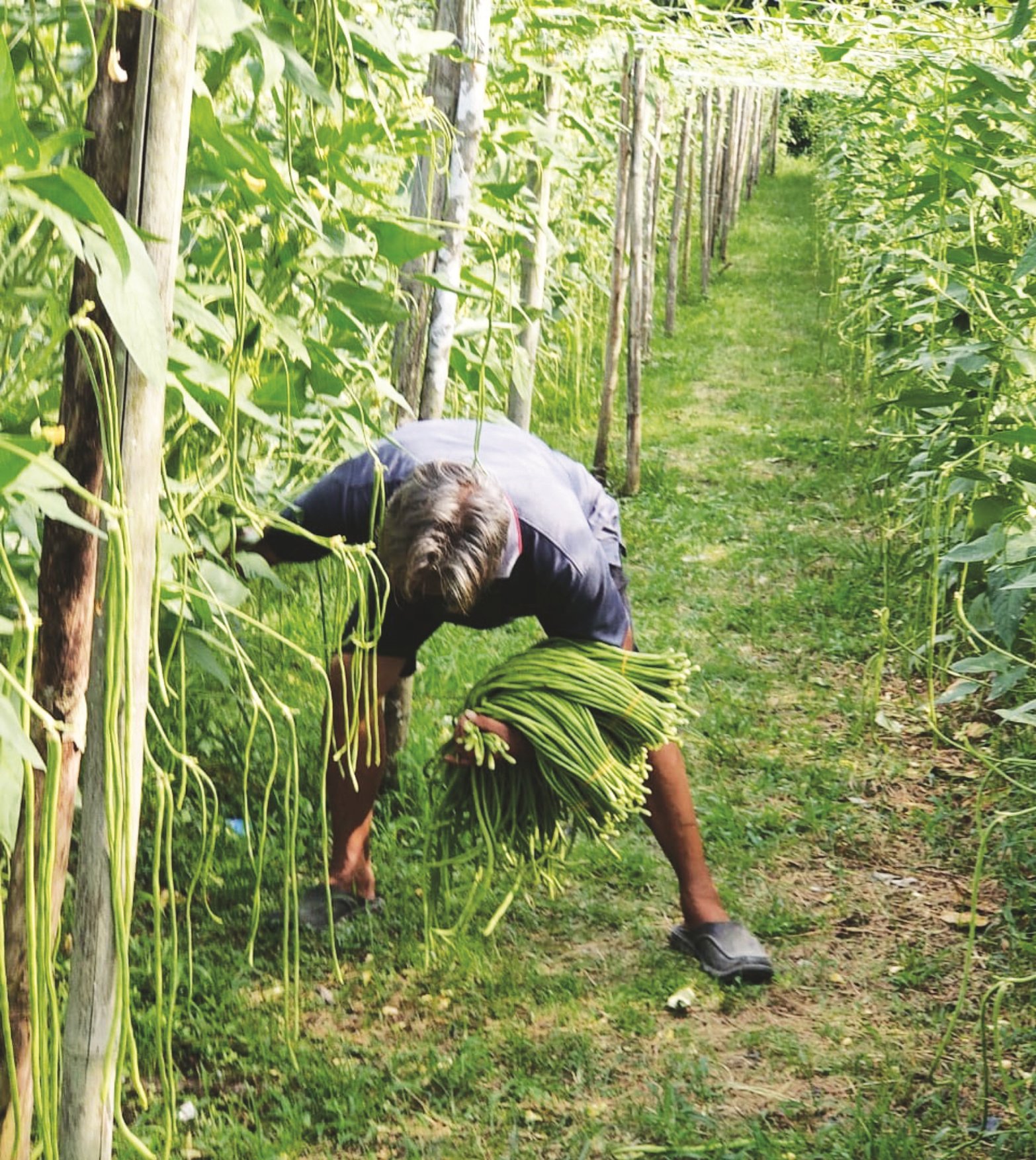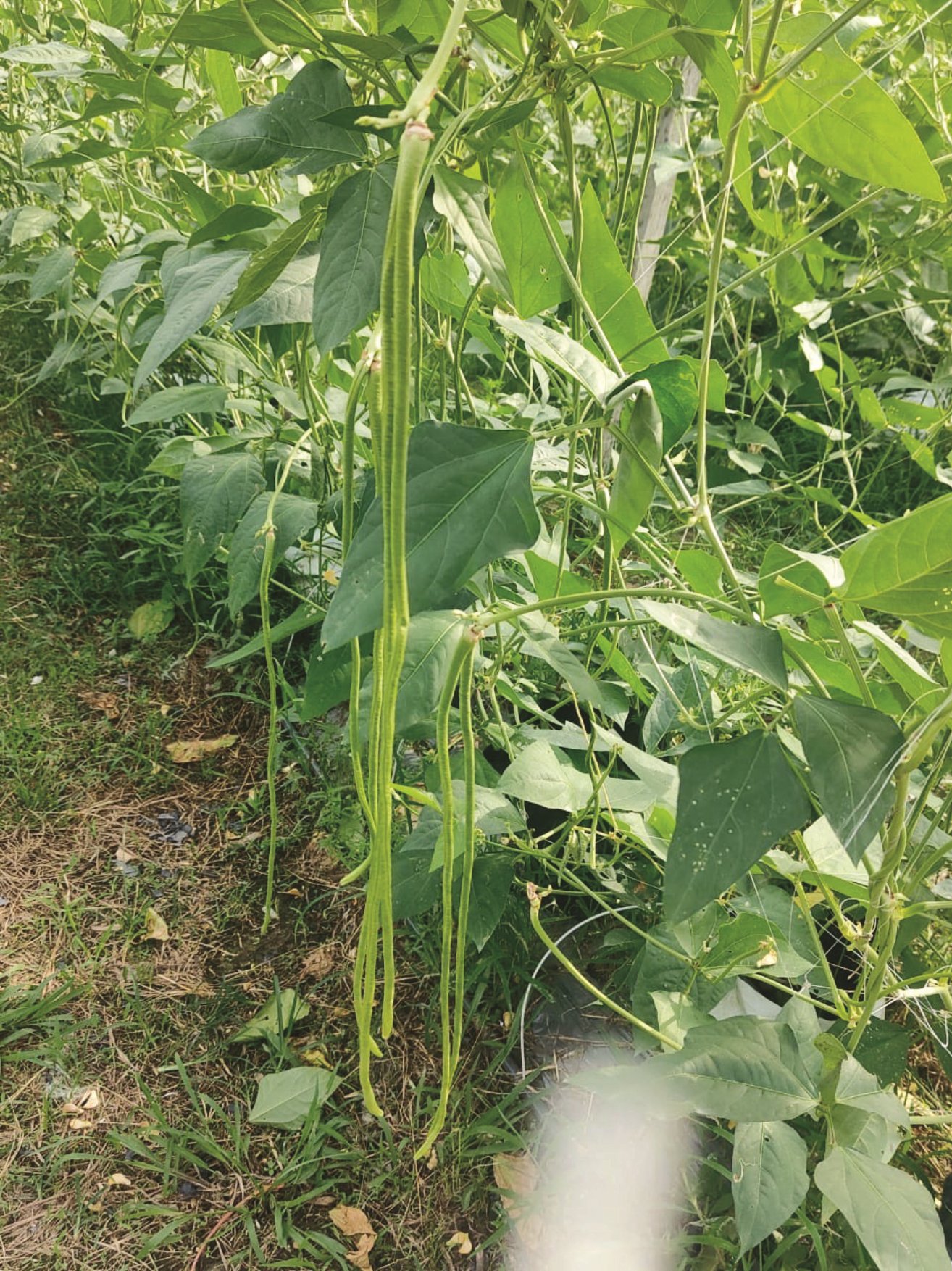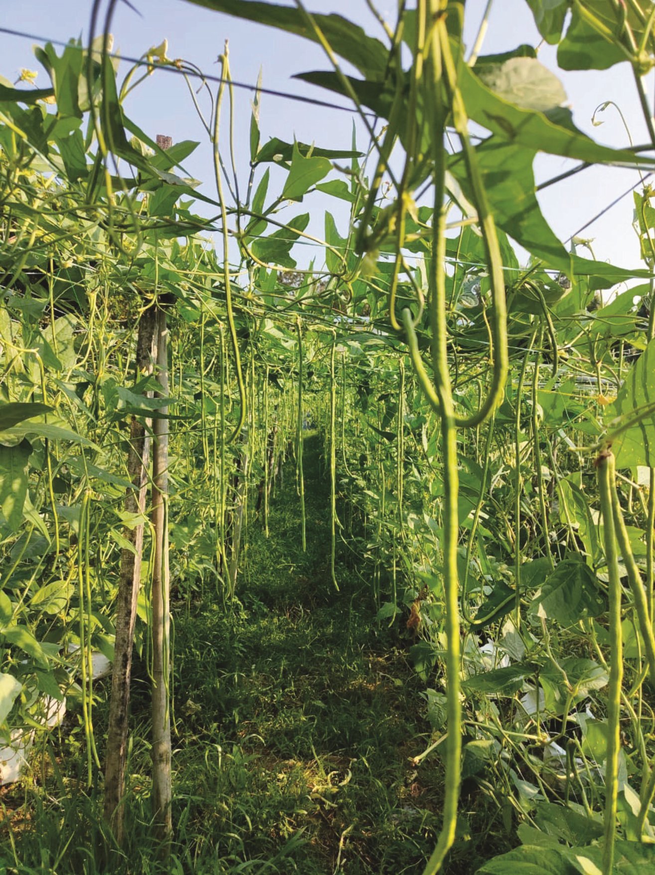 叉字连排架不仅稳固、搭建容易,也便于后续管理。长豆顺势攀爬而上,挂满整座架子,豆荚自然下垂,采摘方便。