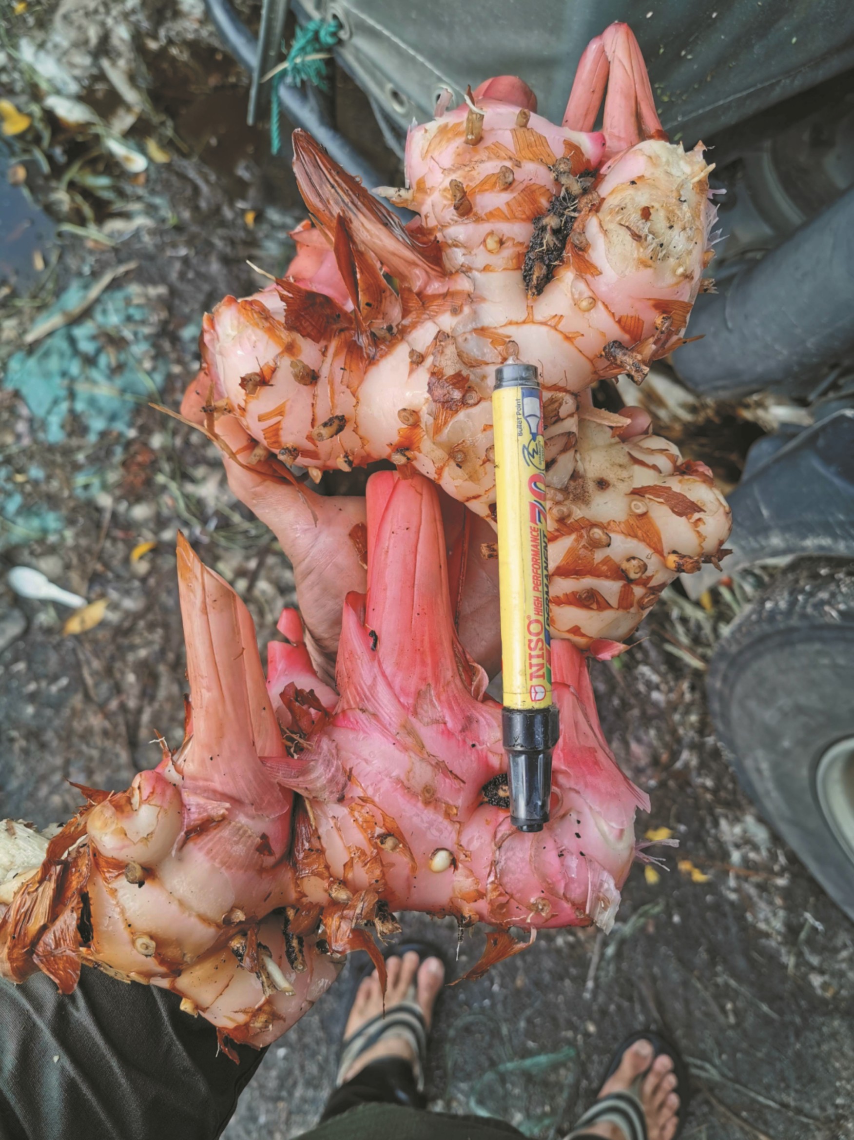 南姜因独特浓郁的香气和较深色的茎节,在市场上辨识度极高。图为南姜,一般长度比手掌大出一倍。